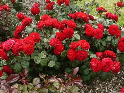 ZIEDS: Ziedu krāsa tumši asinssarkana, samtaini sarkana. Ziedi vidēji lieli, pildīti, ziedi izturīgi. Zied atkārtoti, ļoti bagātīgi un ilgi. Smarža vāja.